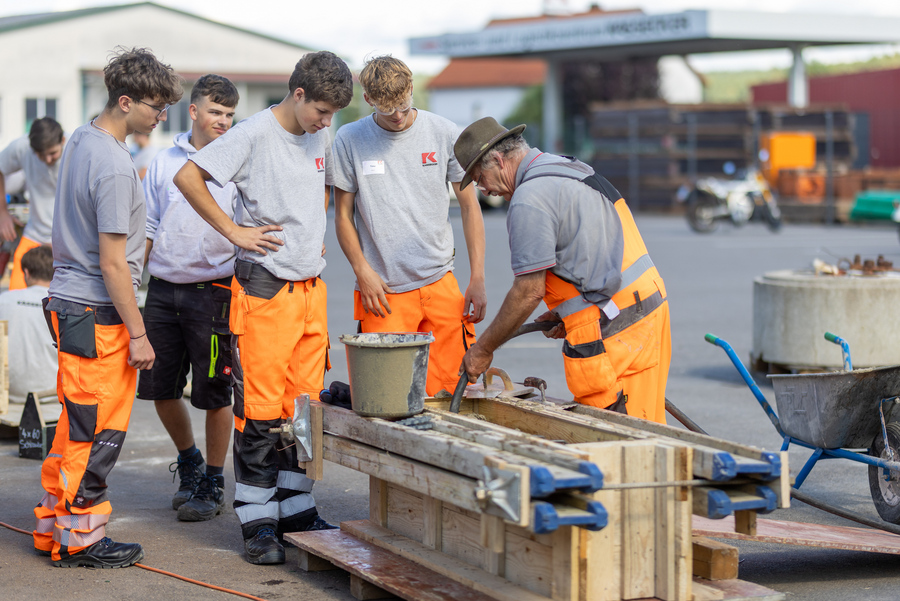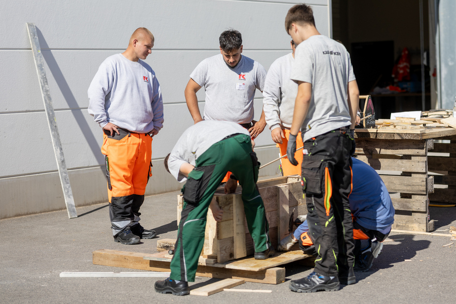 An Tag drei herrschte Hochbetrieb in der KASSECKER Lehrwerkstatt: Kaufmännische, technische und gewerbliche Auszubildende bauten gemeinsam – aufgeteilt in sechs gemischte Gruppen waren insgesamt 35 Azubis aus den Lehrjahren 1 und 2 beteiligt. Das Projektziel: Die Team- und Kommunikationsgrundlagen aus den beiden ersten Tagen festigen, sich weiter kennenlernen und „ganz nebenbei“ etwas mit den eigenen Händen schaffen. Es wurden Pläne studiert, Holz gesägt, Bretter genagelt und Eisen gebogen. Feingefühl brauchte es zum Ausarbeiten des Waldsassener Stadtwappens, das als Matrize in die Schalung eingearbeitet wurde. Am Ende entstanden so Schalungen für insgesamt sechs Betonsitzbänke, die nach Fertigstellung im Waldsassener Stadtgebiet aufgestellt werden sollen.