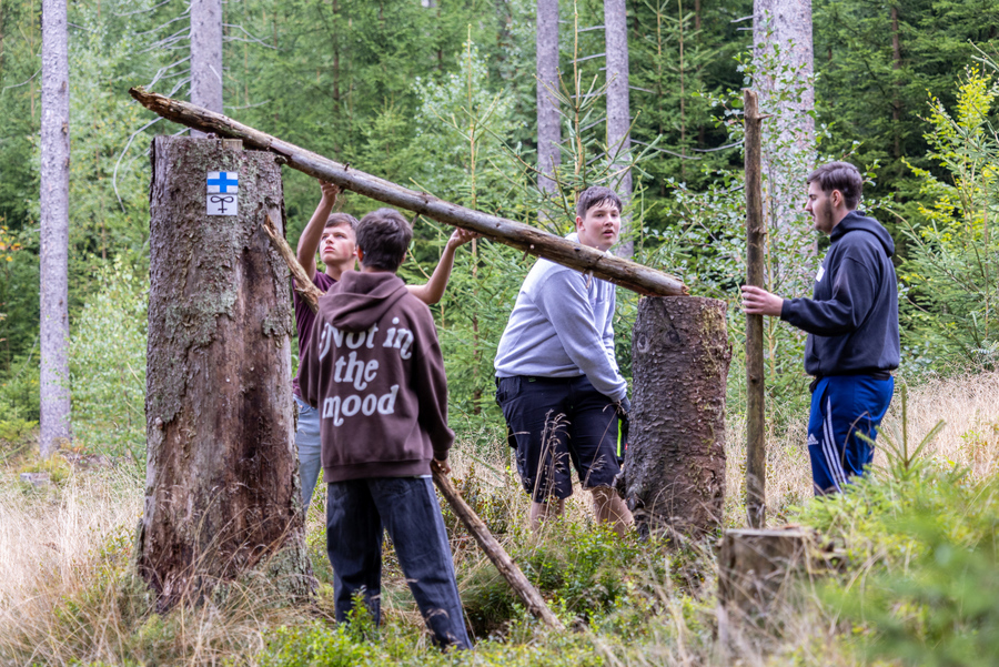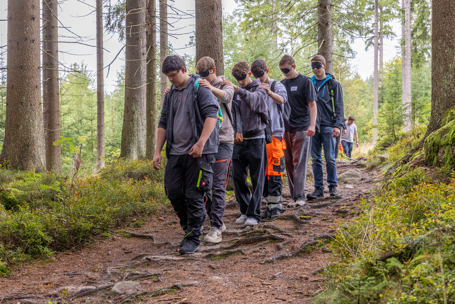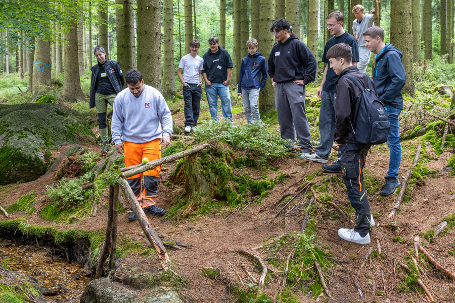 Am zweiten und dritten Tag trafen die Auszubildenden mit ihren Kollegen aus dem zweiten Lehrjahr zusammen: In Arzberg besichtigten sie das Bauprojekt MiA, das kurz vor der Fertigstellung steht. Gesellschafter und ehemaliger KASSECKER-Geschäftsführer Bernd Fürbringer führte als Bauherr persönlich über die Baustelle. Der anschließende Ausflug ins Bullhead House am Ochsenkopf stand ganz im Zeichen des Miteinanders, des gegenseitigen Vertrauens und der Stärke als Team. Sich mit verbundenen Augen als Menschenkette durch ein unwegsames Waldstück führen oder eine Kugelbahn mit Materialien aus der Natur bauen, prägte den Tag. Das Wetter am Nachmittag meinte es leider nicht so gut, sodass manche Aktivitäten teilweise oder ganz ins sprichwörtliche Wasser fielen. Den Erlebnisfaktor ließen sich die Ausflügler dadurch jedoch keineswegs schmälern.