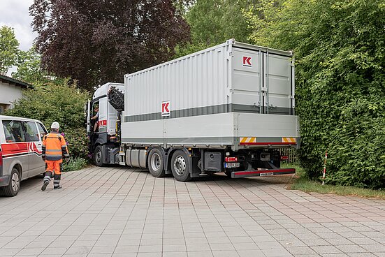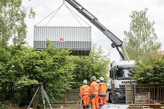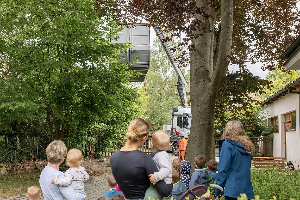 Das Highlight des Tages war die Anlieferung: Der große Container schwebte spektakulär am Kran durch die Luft, bevor er präzise im Garten abgesetzt wurde. Für die Kinder ein unvergessliches Erlebnis.