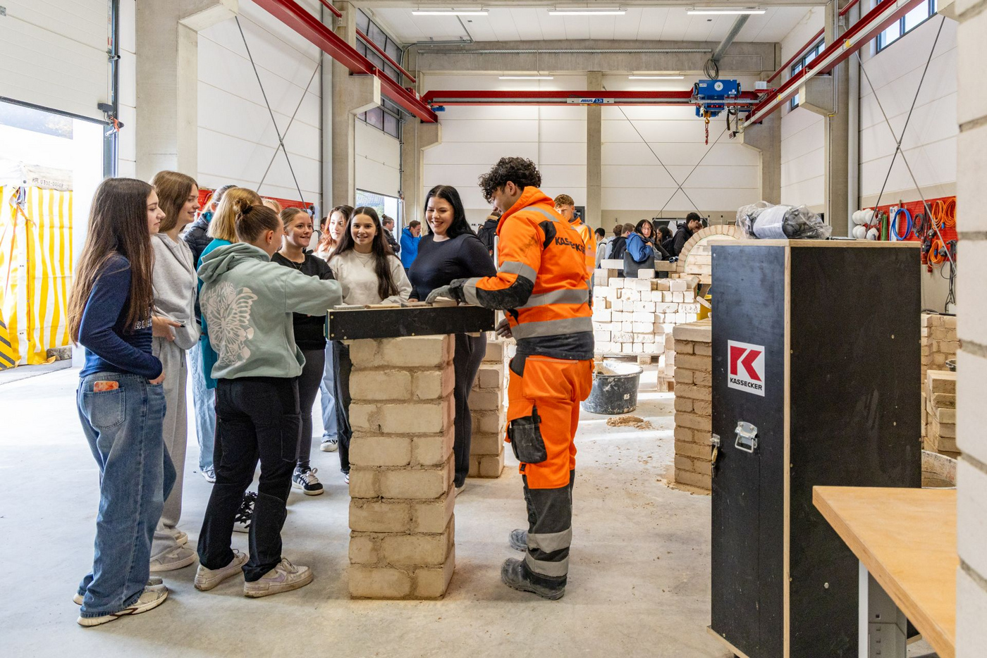 Zusammen mit ihren Lehrkräften machten sich Schülerinnen und Schüler auf den Weg, um Station für Station die vielfältigen Berufsmöglichkeiten zu erkunden. Über die Ausbildung zum Land- und Baumaschinenmechatroniker, zum Metallbauer bis hin zum Bauzeichner oder einer Lehre im kaufmännischen Bereich lauschten die Klassen in abwechslungsreichen Vorträgen. Handfester wurde es in den „klassischen“ gewerblichen Bauberufen Beton- und Stahlbetonbauer, Maurer sowie Rohrleitungsbauer. Dort waren die Jugendlichen angehalten, selbst Kelle, Wasserrohr, Schraubenschlüssel oder den Hammer in die Hand zu nehmen. Bei vielen der Aufgaben und den damit verbundenen Berufen stellte sich die Erkenntnis ein: Die Baubranche ist längst keine reine Männerdomäne mehr, nicht zuletzt weil auch technische Hilfsmittel die Arbeit erleichtern. Seit mehreren Jahren öffnet Kassecker bewusst die Pforten für mehr weibliche Auszubildende in den technischen und gewerblichen Berufen.