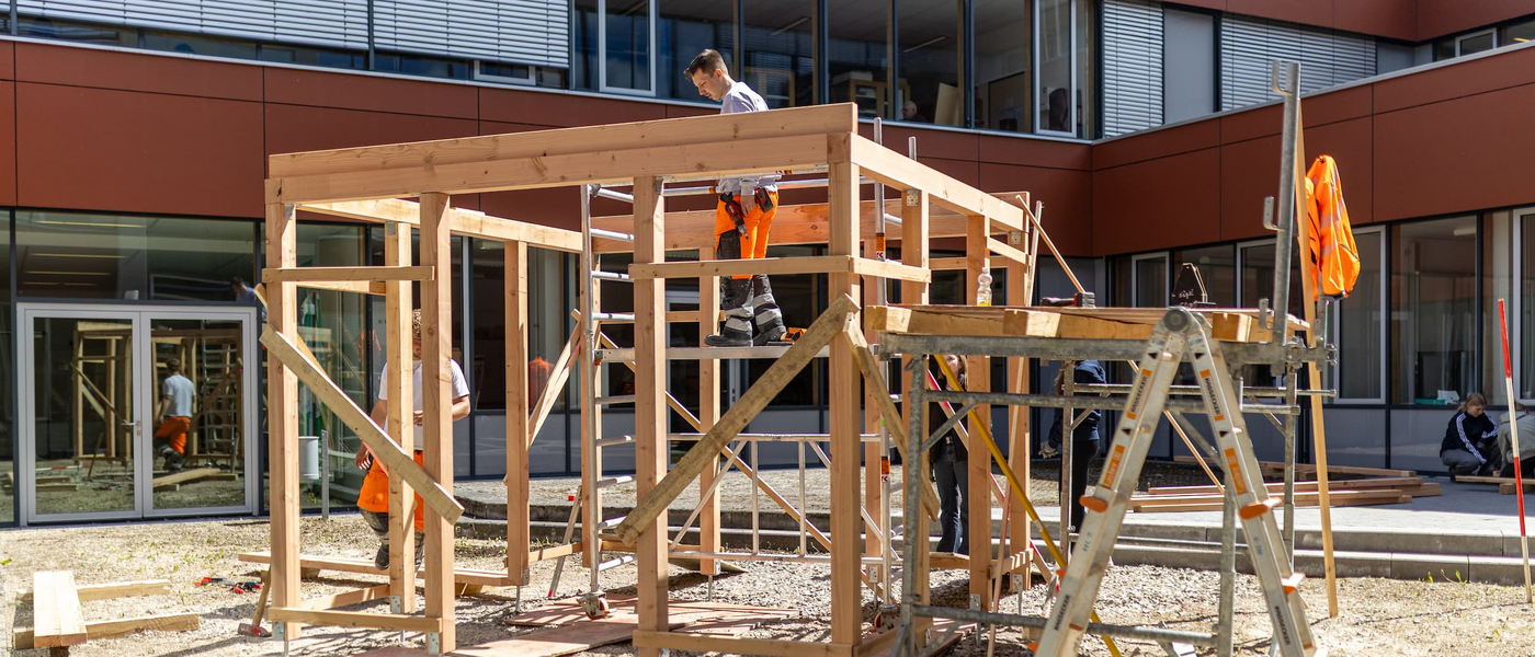 Im Ausbildungszentrum der Firma Kassecker fertigten die Auszubildenden gemeinsam mit den Schülern die Bewehrung und Schalung für die Fundamente an. Eine Woche später wurde der 3x3 Meter Holz-Pavillon unter Anleitung der vier Azubis und ihrer Ausbildungsleiter mit viel Engagement und Teamgeist in unserem Innenhof aufgebaut.
