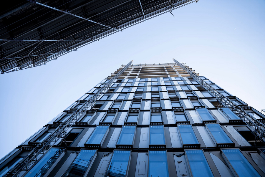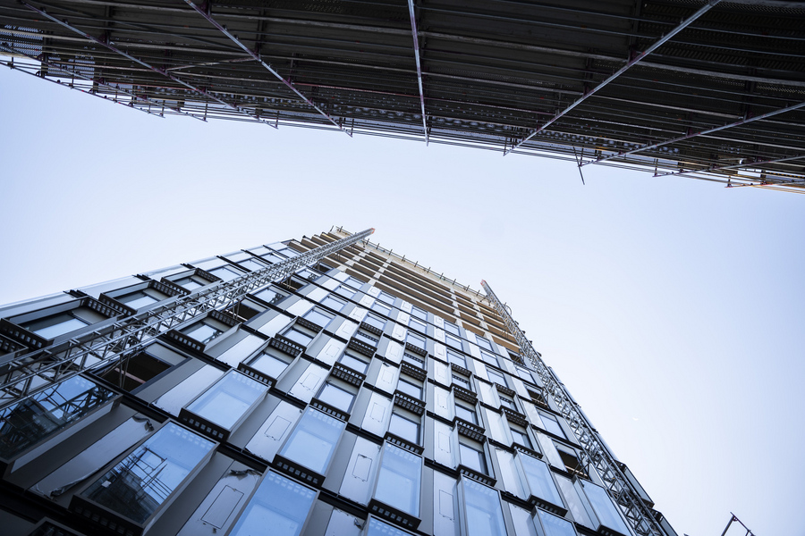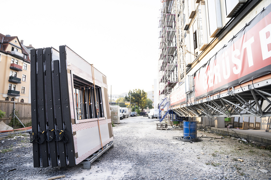 Eine Besonderheit des Bauvorhabens markierte die innovative Montagetechnik: Anstelle eines klassischen Fassadengerüsts kam eine Kletterbühne in Kombination mit einem Laufkatzenkran zum Einsatz. Diese Methode ermöglichte eine sichere wie ebenso wirtschaftliche Montage der Fassadenelemente selbst in großen Höhen und unterstreicht den hohen technischen Anspruch des Projekts.