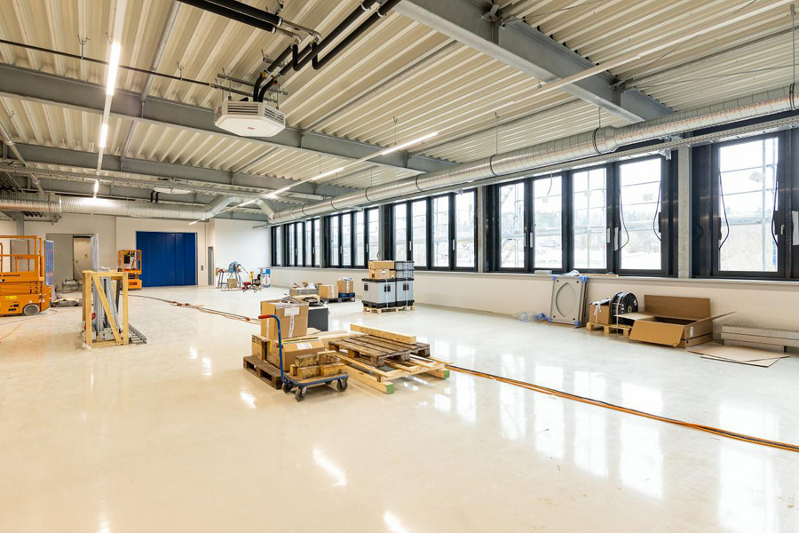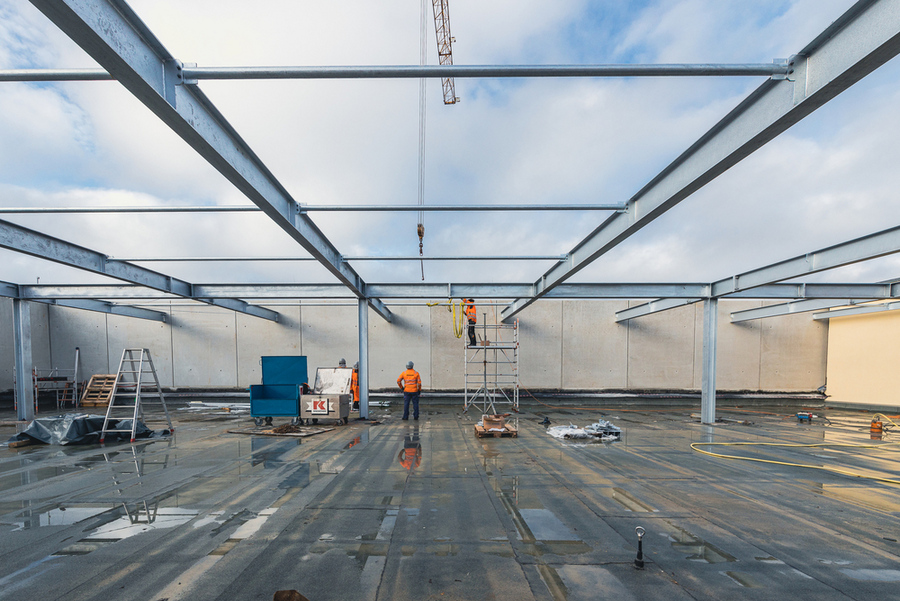 In die Höhe bauen und dabei den Bestand nutzen, lautete die Devise bei der Aufstockung des Produktionsgebäudes. KASSECKER setzte dabei auf eine Mischbauweise aus Stahl, Leichtmetall und Beton. Ein Stahlskelett trägt die Konstruktion, während die Wände aus Betonhalbfertigteilen bestehen. Die großzügige Fensterfront samt Außenraffstore findet in einer Leichtmetallfassade (30 x 3,3 m) Platz und sorgt für ordentlich Tageslicht in den Produktionsräumen. Ein Sandwichdach schließt die Erweiterung nach oben ab.