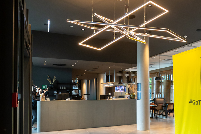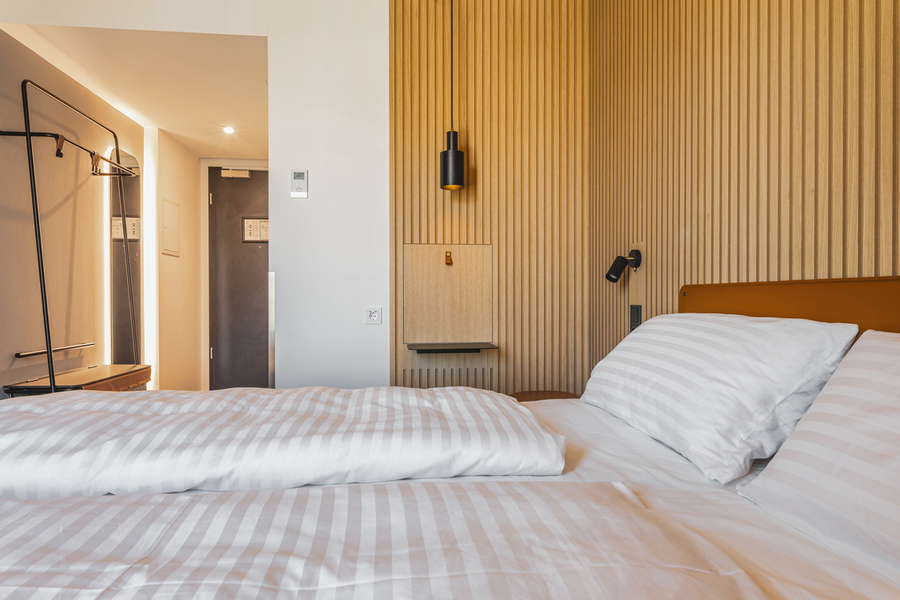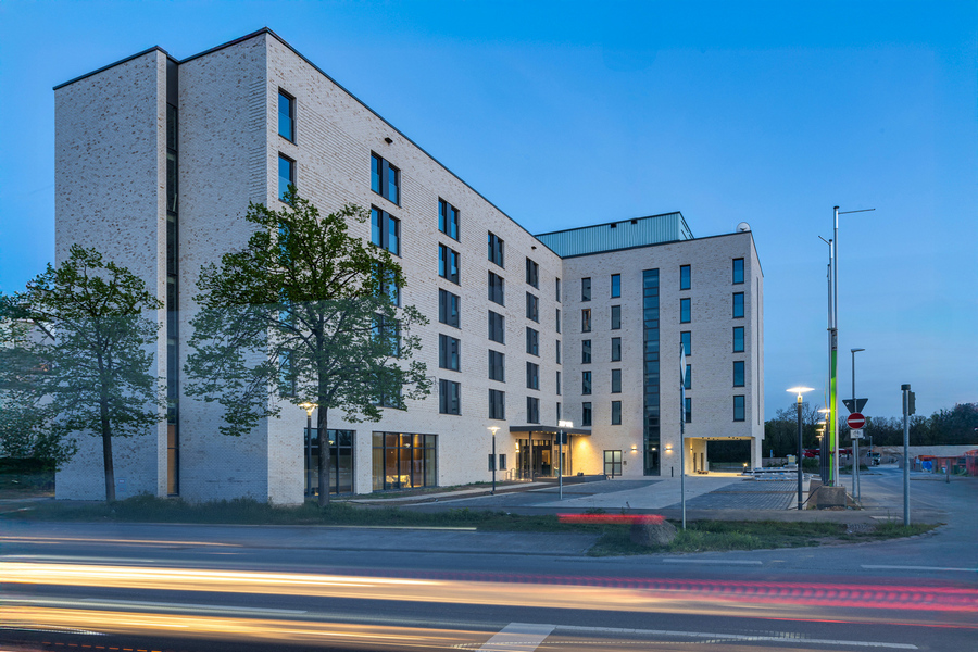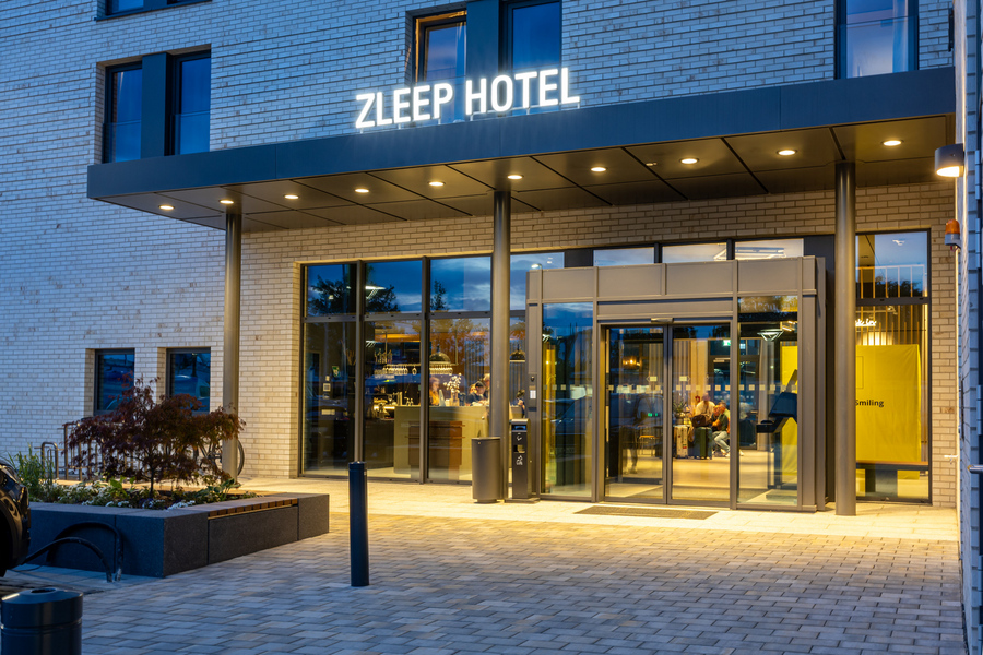 Mitten in der Stadt wuchs ein spannendes Projekt in die Höhe: das neue Zleep Hotel mit insgesamt sechs Geschossen. Neben dem Erdgeschoss und fünf Obergeschossen entstand eine Techniketage mit Photovoltaikanlage. Das Hotel bietet 175 Zimmer – darunter 18 barrierefreie Einheiten – sowie einen großzügigen Lobbybereich mit Back of House im Erdgeschoss. Für Gäste und Besucher steht außerdem eine zweistöckige Parkpalette mit 70 Stellplätzen zur Verfügung.