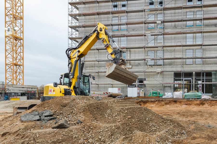 Erweiterter Rohbau: 80 cm Bodenplatte, alle Außenwände, Decken, Treppenhaus- und Aufzugskerne in Ortbeton