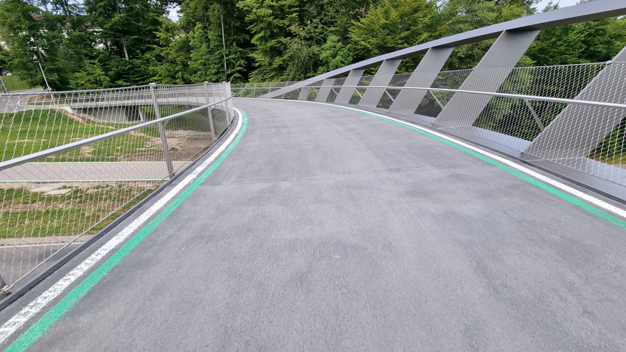 Nach 21 Monaten Bauzeit durfte KASSECKER gemeinsam mit Stadt, Land und Bund die neue Radschnellwegbrücke über die Panzerstraße im Sommer 2025 offiziell freigeben. Damit wurde ein weiterer wichtiger Baustein der Radschnellverbindung RS 1 geschafft – sicher, schnell und kreuzungsfrei für alle Radfahrer und Fußgänger. Mit einer maximalen Steigung von fünf Prozent ist die Brücke nicht nur komfortabel für Radfahrer, sondern auch bestens für Fußgänger, Familien und Rollstuhlfahrer geeignet. Das sanft geschwungene Bauwerk aus Stahl und Asphalt fügt sich harmonisch ins Stadtbild ein und wird durch moderne LED-Handlaufbeleuchtung auch nachts zu einem sicheren und ästhetischen Element der Infrastruktur.