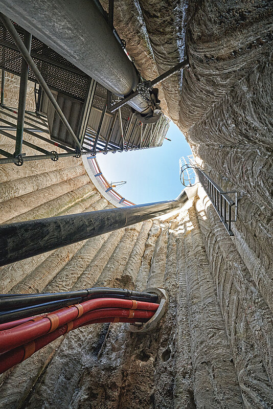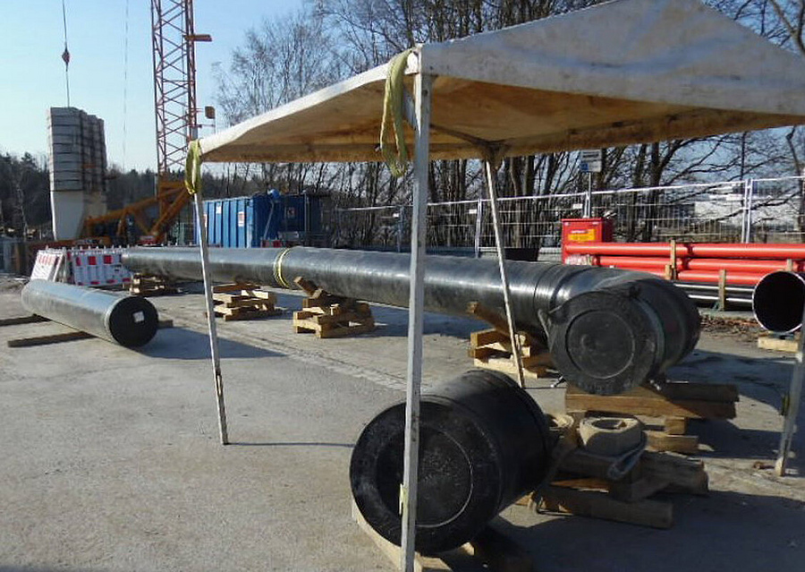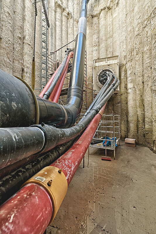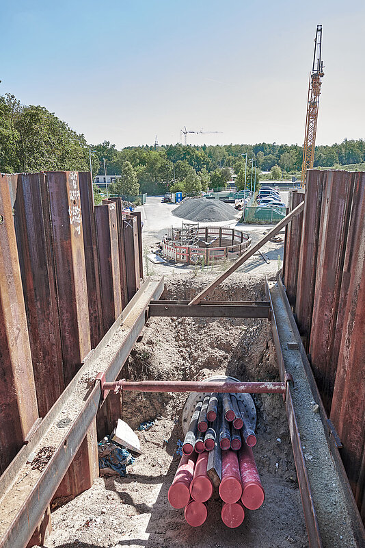 Die Start- und Zielbaugruben (T = 25 m unter GOK) wurden im verformungsarmen Verbauverfahren mittels überschnittenen Bohrpfählen hergestellt. Zur Realisierung der Biegeradien für 110 kV wurden schräge Microtunnelingvortriebe DN 1000 bis an die Geländeoberfläche aufgefahren.