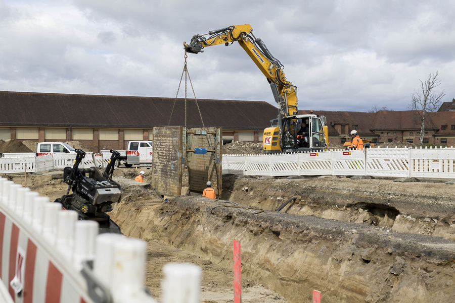 Auf dem ehemaligen Kasernengelände der US-Armee musste jederzeit mit dem Antreffen von Munition und Kampfmitteln gerechnet werden, was eine kontinuierliche Begleitung durch den Kampfmittelsondierungsdienst sowie sensibel geschultes und agierendes Personal bei den Erdarbeiten erforderte. Durch die notwendigen Leitungstiefen bis 4,50 m unter Geländeoberkante und der vorhandenen Geologie in diesem Gebiet, wurde eine Grundwasserhaltung unverzichtbar. Diese kontrollierte Ableitung des angetroffenen Schichten- und Grundwassers erfolgte mittels einer vorauseilend eingefrästen Tiefendrainage, welche nach Abschluss der Bauarbeiten verschlossen wurde und im Baugrund verblieben. Überschussboden aus den Rohrgräben wurde auf einer vom Aauftraggeber bereitgestellten Fläche in Mieten zu je 500 m³ aufgehäuft und analysiert. Die Abfuhr erfolgte im Nachgang durch den Auftraggeber.